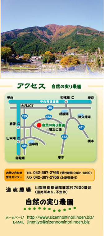 TEL/FAX 042-387-2766 〒402-0200 山梨県南都留郡道志村7600番地 道志農場 自然の実り農園